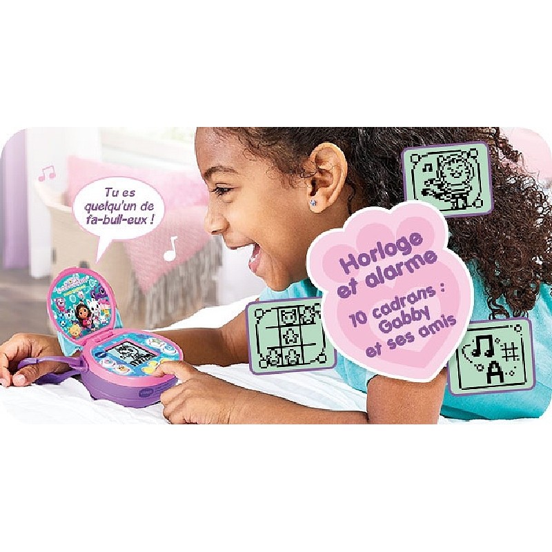 La console inclut 10 cadrans horloge et alarme illustrés par les personnages emblématiques de la série : Gabby, Pandy Pattes, Bébé Boîte, Fée Minette, Chabriolette, DJ Miaou, Marine, P’tichou, Polochat et Sacha. Un moyen ludique d’apprendre à lire l’heure et de programmer un réveil.