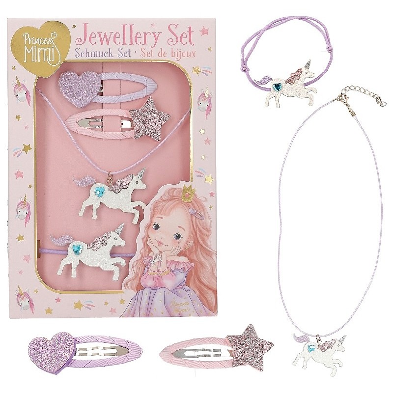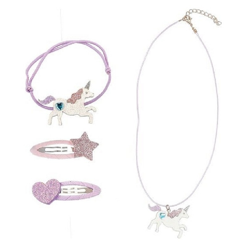 Pack de bijoux licorne 4 pièces Princess Mimi par Depesche aux tons rose et violet. Ensemble composé de deux barrettes en métal recouvertes de tissu, ornées d’un cœur et d’une étoile pailletés, d’un collier réglable avec pendentif licorne scintillant et d’un élastique assorti pouvant aussi se porter au poignet.